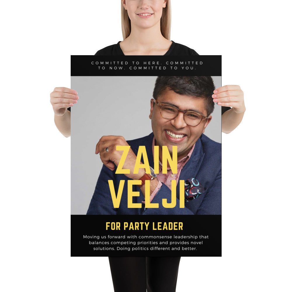 Zain Velji believes things. Things that you believe. And he's not going to do things the same old ways. He's got new ways that balance competing priorities. He makes tough but popular decisions and he never loses focus on what matters - the things that matter to you. His leadership bid began in your heart the minute you heard him talk over the intro music. Two feet tall, this is a big poster for his big ideas. Thick and durable matte paper.